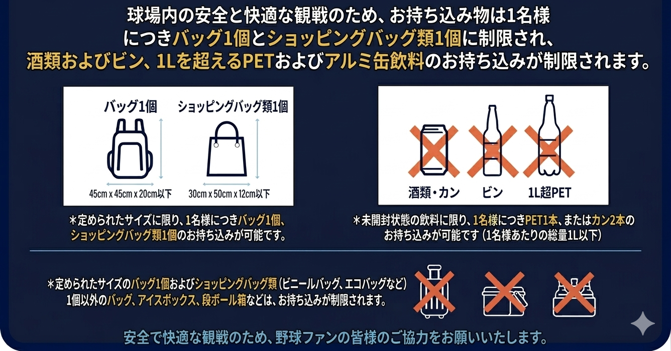 💡 TIP スタジアムは外部からの飲食物の持ち込みが可能です。 少し早めに到着して、近くで食べ物を買ったり、デリバリーを注文するのもおすすめです! ⚾🍔